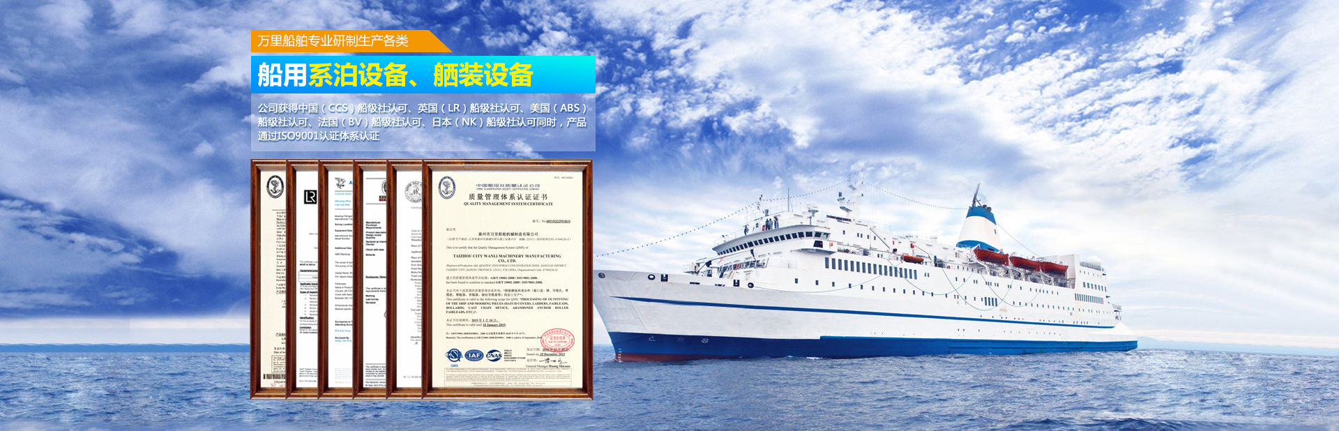 泰州市萬里船舶機械制造有限公司位于姜堰市西郊橋頭工業(yè)集中區(qū),東臨寧靖鹽高速公路,南傍寧啟鐵路及328國道,距泰州火車站10公里,交通十分便利。 本公司是一家研制生產各類船用系泊設備、舾裝設備的專業(yè)廠家,所生產產品品種齊全、質量可靠。其中導纜器、導纜滾輪、導纜孔、帶纜樁、棄錨器、人孔蓋、導鏈滾輪廣泛應用于國內各大船廠,同時外銷日本、韓國、西班牙、意大利、臺灣等國家及地區(qū)。本公司已獲得中國(CCS)船級社認可、英國(LR)船級社認可,美國(A···